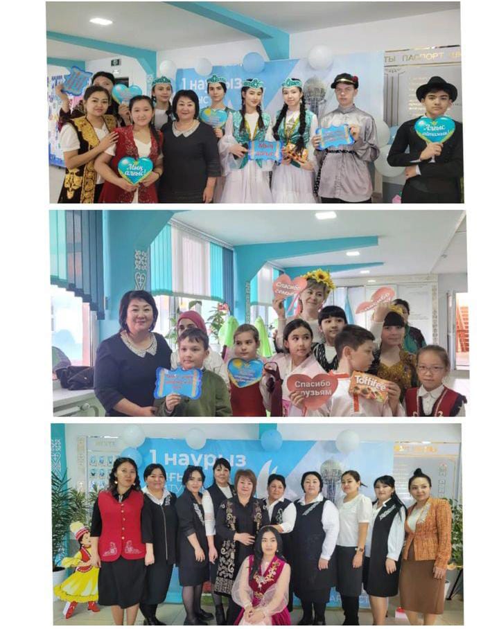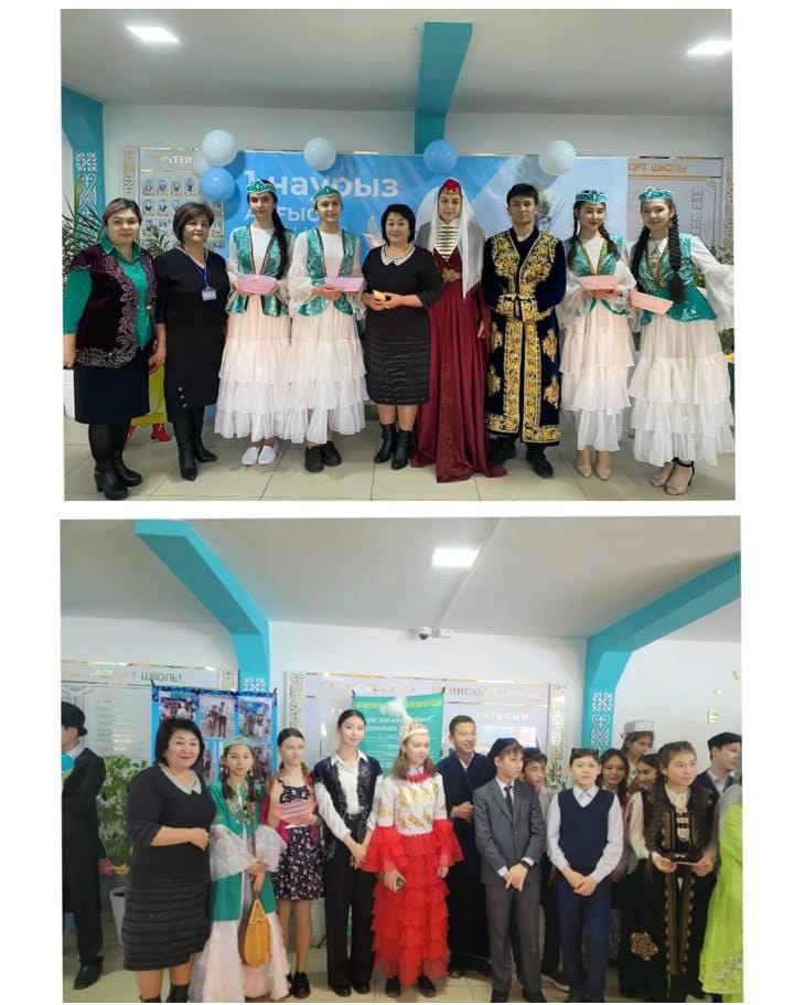 1-наурыз күні мектебімізде "Қазақ тілі мен әдебиеті" апталығы басталып, алғыс айту күніне әр ұлт өкілдері ұлттық киімдерімен қатар өз ана тілдерінде алғыс сөздерін арнады. Бұл іс- шараның мақсаты: өзара бірлік пен татулыққа тәрбиелеу. Сонымен бірге қазақтың қоңыр домбырасымен әннен шашу шашылып,қазақтың әсем биі апталықтың ашылуының сәнін келтірді.