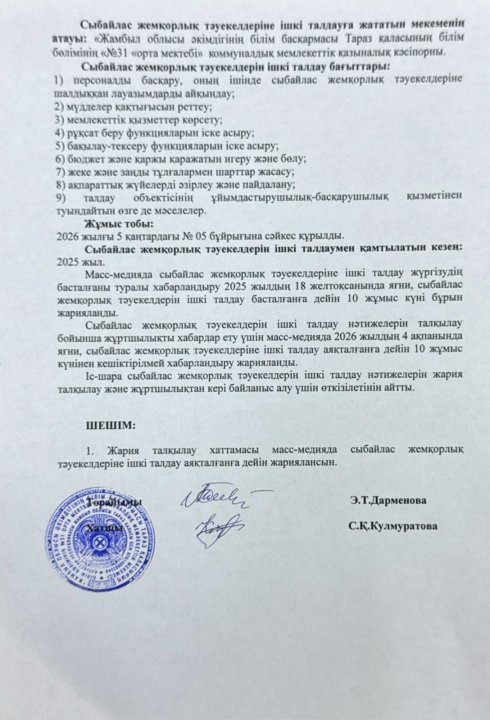 11 февраль 2026 0 1 2 3 4 5 Сыбайлас жемқорлық тәуекелдерін ішкі талдау нәтижелерін жария талқылау ХАТТАМАСЫ