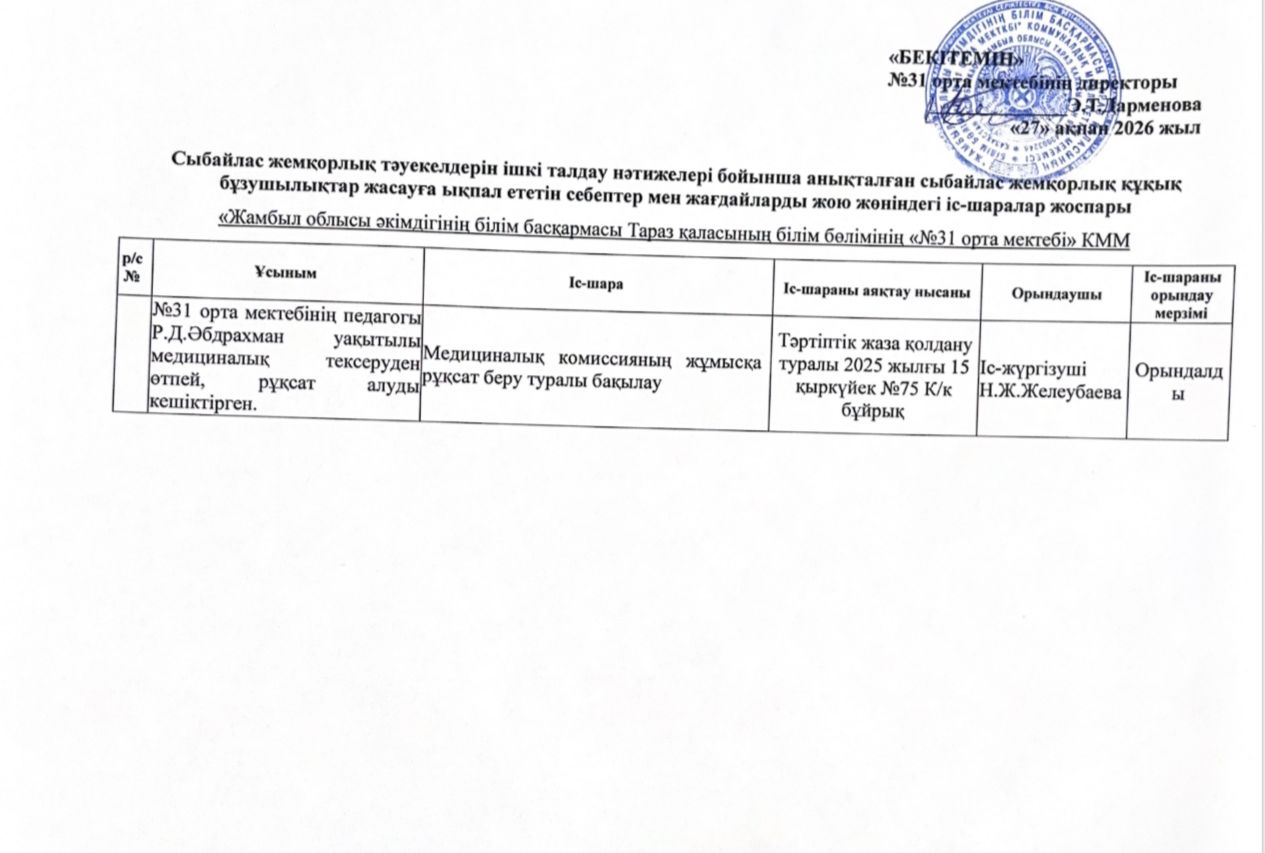 Сыбайлас жемқорлық тәуекелдерін ішкі талдау нәтижелері бойынша анықталған сыбайлас жемқорлық құқық бұзушылықтар жасауға ықпал ететін себептер мен жағдайларды жою жөніндегі іс-шаралар жоспары » СШ №31