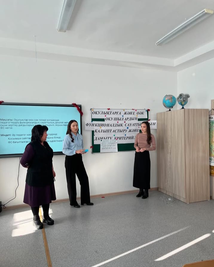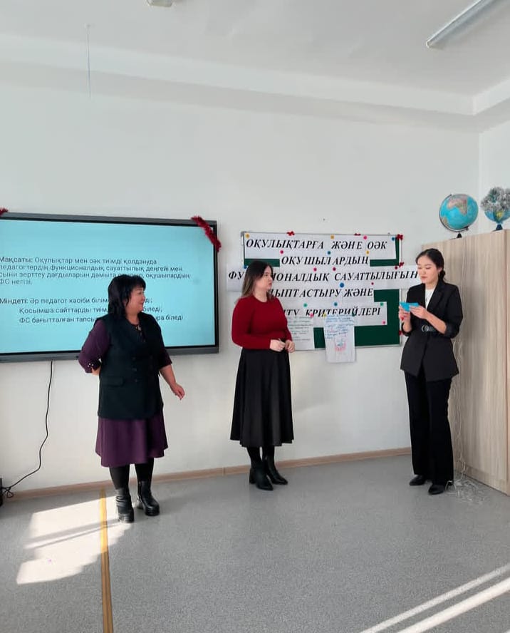 Бүгін мектебіміздің директоры Дарменова Эльнара Тураровна “Оқулықтар мен ОӘК негізінде оқушылардың функционалдық сауаттылығын қалыптастыру және дамыту критерийлері” тақырыбында коучинг өткізді.